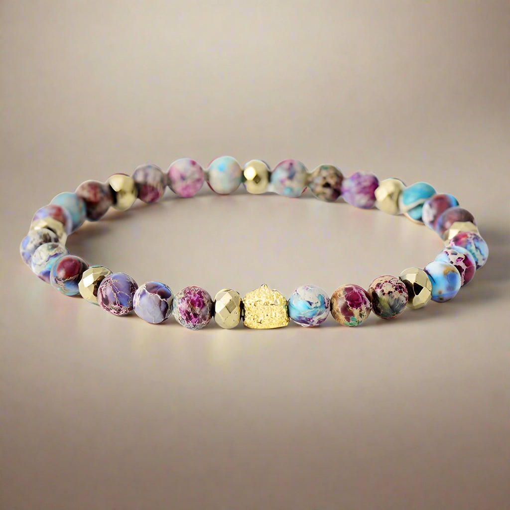 Genießen Sie die entspannte Eleganz unseres Jasper Lavender Steinarmbands. Dieses handgefertigte Schmuckstück mit kleinen Jaspisperlen verwandelt Ihr Handgelenk in eine Wohlfühloase. Denn wer hat gesagt, dass Accessoires nicht auch ein Spa-Tag für Ihre Seele sein können?