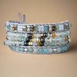 La pulsera presenta preciosas cuentas de piedras de amazonita y aguamarina, que aportan una energía terrosa y relajante a tu colección de accesorios.