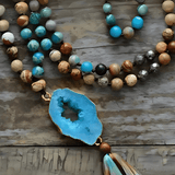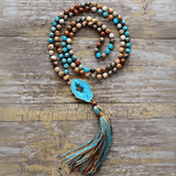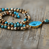 Les couleurs de la terre dans toutes leurs expressions, des tons neutres sableux doux aux bleus ciel. Dans ce Mala, nous avons mélangé différents types de pierres de jaspe et de pyrite. Ce Mala est prêt pour que vous puissiez définir vos intentions et laisser l'univers vous guider tout au long de votre voyage. Ce collier mala peut être porté en collier ou utilisé pour soutenir vos pratiques de méditation.