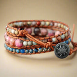 Ce bracelet enveloppant est une fusion de cuir et de pierres naturelles telles que la rhodonite et le jaspe. Chaque pierre a sa propre histoire à raconter. La rhodonite, connue pour ses propriétés apaisantes, et le jaspe, symbolisant l'ancrage et la stabilité, se combinent pour créer l'équilibre qui résonne avec votre énergie intérieure.